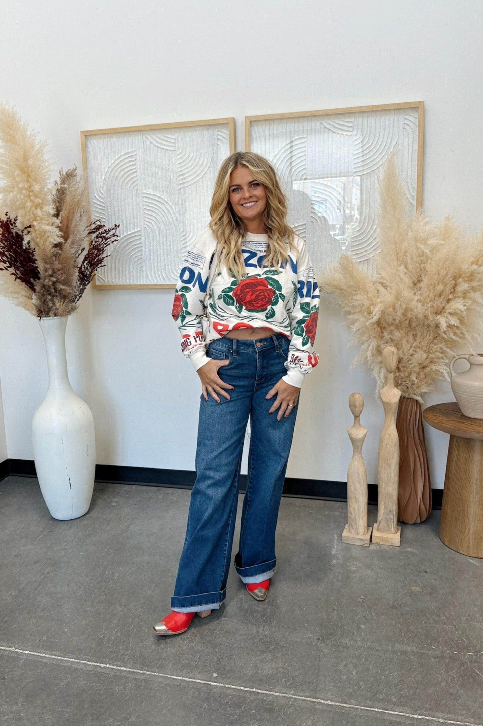 Western vintage vibes. I usually wear a medium but this medium has some stretch so I could have ordered a small. It soft and very comfortable.