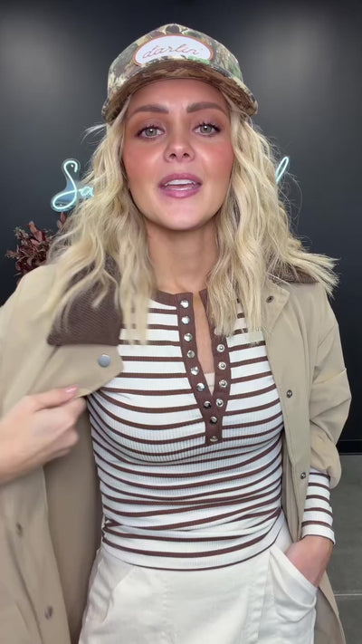 Your new everyday long sleeve is here. This striped henley brings that clean, effortless vibe you can wear year-round. Soft, stretchy, and perfectly fitted, it layers like a dream and stands strong on its own. The contrast button placket adds just the right touch of detail without taking away from its neutral, timeless feel.