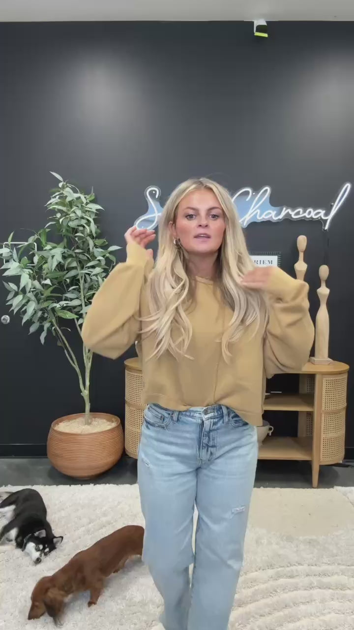 - Round neck, balloon sleeve, oversized fit with raw edge stitch detail.
