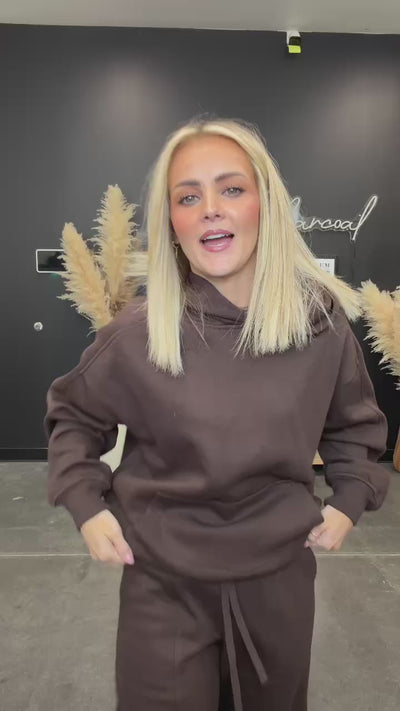 You know the set you will live in all season? These joggers are made from the softest fleeced French terry with a brushed interior that feels like a warm hug. Designed with a relaxed, cocoon-inspired fit and mid-rise waist, they strike that perfect balance between comfy and cute. The adjustable elastic waistband keeps things easy, while the side pockets and subtle seam details give them a polished finish. Pair them with the matching hoodie for a full-on cozy set moment (you’ll live in it, trust us).