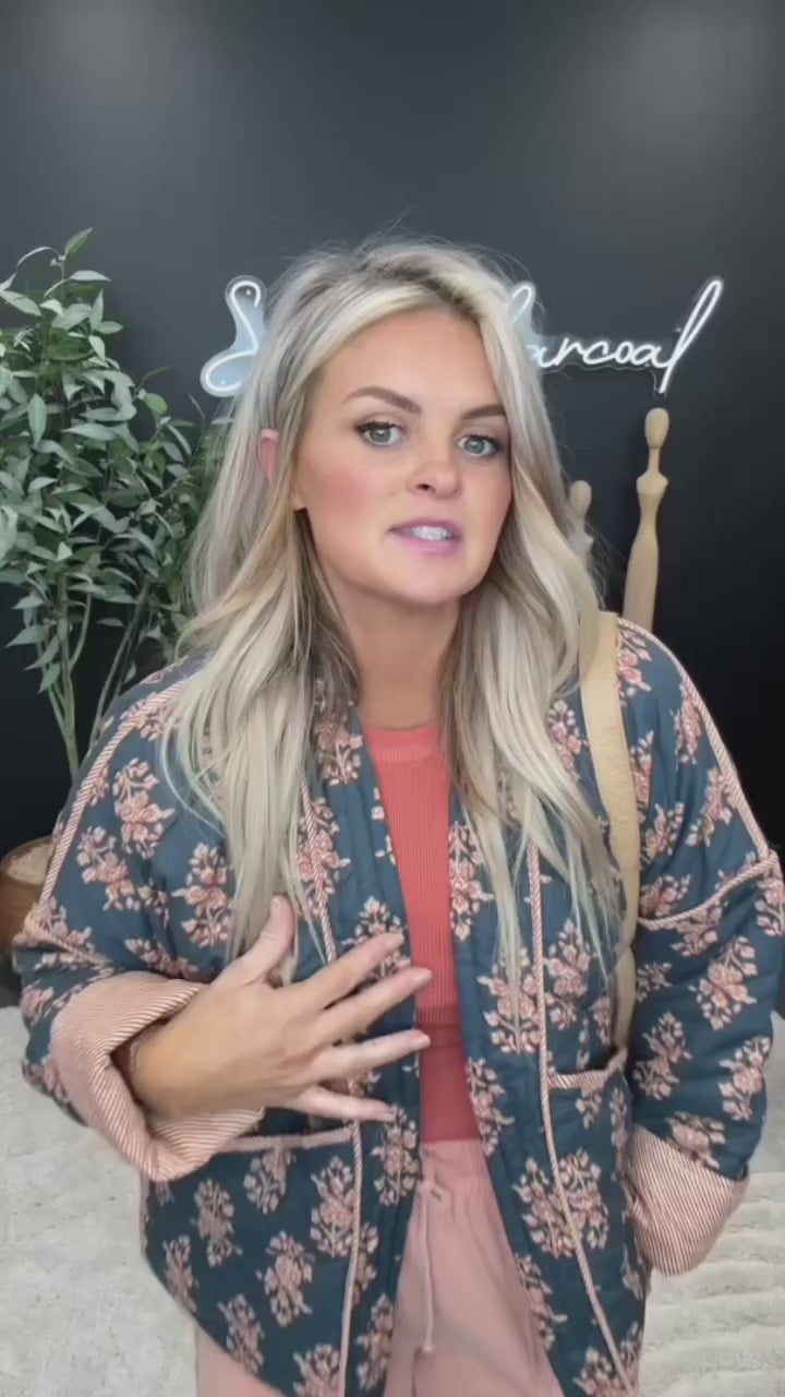 - Woven Cotton Print Quilted Long Sleeve Open Front Jacket.