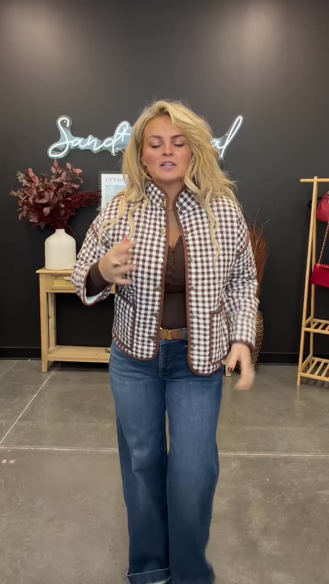 This gingham quilted jacket is the kind of piece that instantly makes an outfit feel pulled together. Designed with a softly padded, cozy feel and warm, neutral tones, it features contrast piping that adds just the right amount of structure. The relaxed, boxy silhouette makes it easy to layer, while snap-button closures and front patch pockets keep it practical for everyday wear. It’s timeless, comfortable, and effortlessly cute—exactly what your fall-to-winter wardrobe needs.