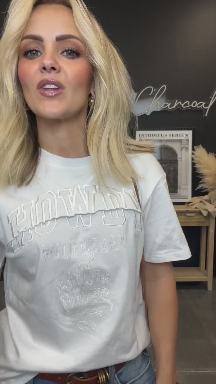 Say it louder: Howdy!  This tee keeps it classic in the front with simple embroidery and brings the fun on the back with a bold “Howdy” graphic. Designed in crisp white, it’s the perfect not-so-basic tee to throw on with denim, layer under a jacket, or tuck into a skirt for that casual-cool vibe. Easy, comfy, and full of personality—just how we like it.