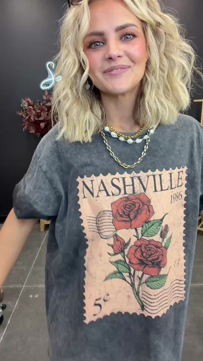 This tee channels effortless Nashville charm with a nostalgic postage stamp–style graphic and soft, lived-in mineral wash. Designed with a relaxed boyfriend fit, it drapes just right for that easy, borrowed-from-the-boys feel while still styling beautifully with denim, cutoffs, or layered under a jacket. The faded charcoal tone and rose graphic give it that perfectly worn, timeless look you’ll keep reaching for.