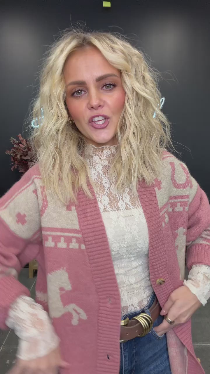 Slip into cozy Western vibes with this oversized knit cardigan, designed with a dreamy rose-pink palette and subtle Western-inspired graphics throughout. It’s the throw-on-and-go layer that feels nostalgic, warm, and effortlessly cute with denim, leggings, or your favorite basics. Soft, slouchy, and ready for every chilly day.