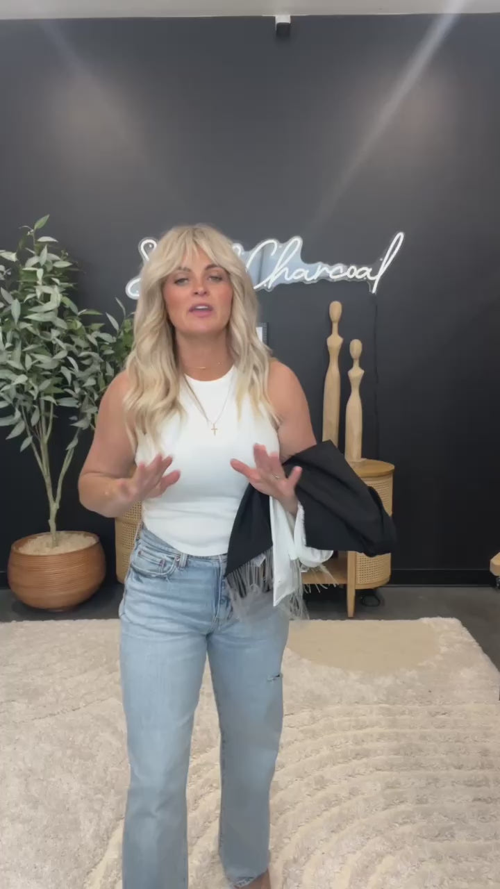 • Cropped raw edge vest with fringe.